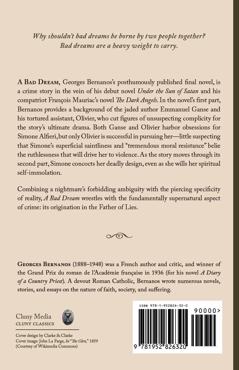A Bad Dream, Georges Bernanos’s posthumously published final novel, is a crime story in the vein of his debut novel Under the Sun of Satan and his compatriot François Mauriac’s novel The Dark Angels. In the novel’s first part, Bernanos provides a background of the jaded author Emmanuel Ganse and his tortured assistant, Olivier, who cut figures of unsuspecting complicity for the story’s ultimate drama. Both Ganse and Olivier harbor obsessions for Simone Alfieri, but only Olivier is successful in pursuing her—little suspecting that Simone’s superficial saintliness and “tremendous moral resistance” belie the ruthlessness that will drive her to violence. As the story moves through its second part, Simone concocts her deadly design, even as she wills her spiritual self-immolation.