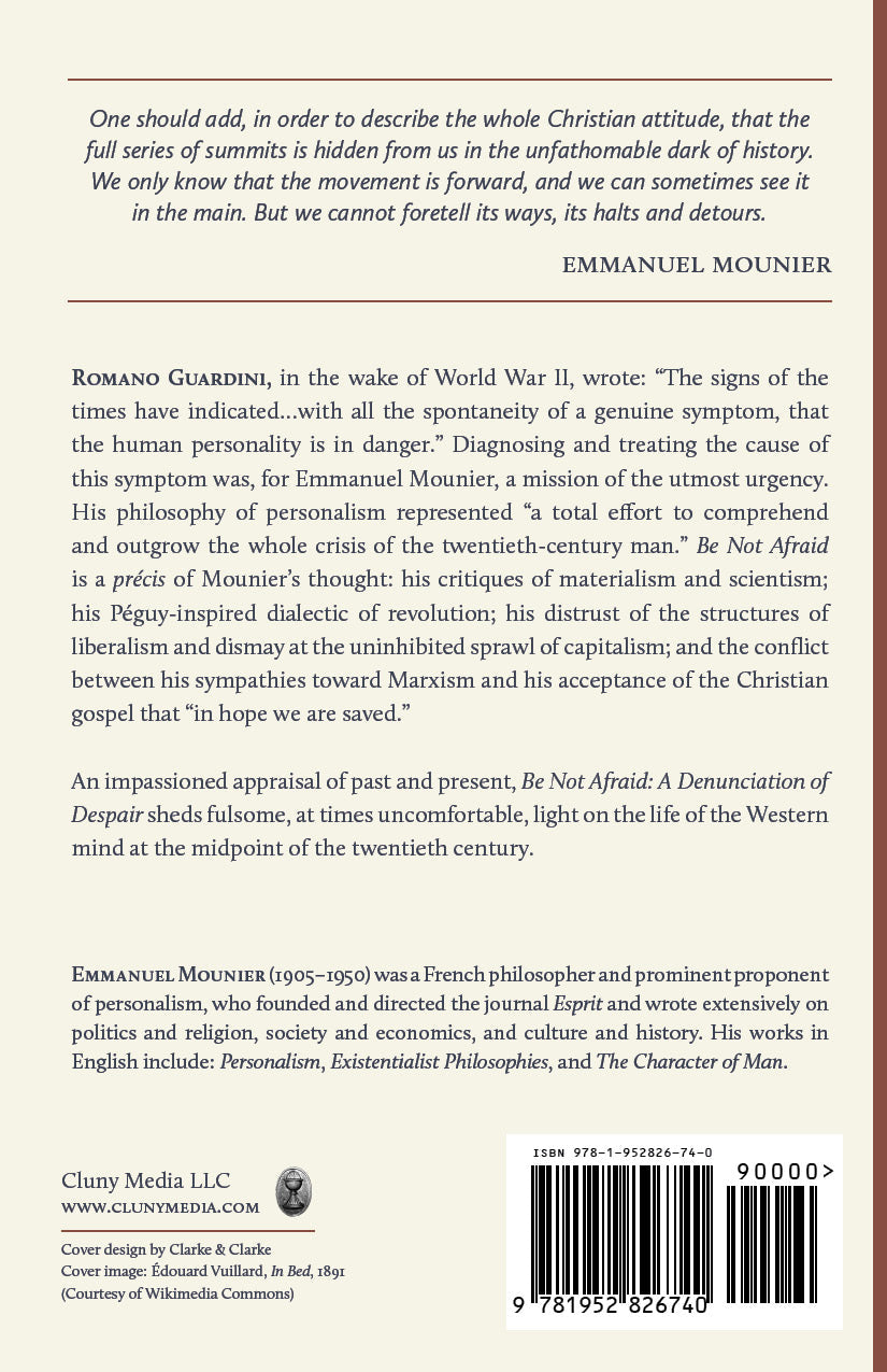 Romano Guardini, in the wake of World War II, wrote: “The signs of the times have indicated…with all the spontaneity of a genuine symptom, that the human personality is in danger.” Diagnosing and treating the cause of this symptom was, for Emmanuel Mounier, a mission of the utmost urgency. His philosophy of personalism represented “a total effort to comprehend and outgrow the whole crisis of the twentieth-century man.” Be Not Afraid is a précis of Mounier’s thought: his critiques of materialism and scientism; his Péguy-inspired dialectic of revolution; his distrust of the structures of liberalism and dismay at the uninhibited sprawl of capitalism; and the conflict between his sympathies toward Marxism and his acceptance of the Christian gospel that “in hope we are saved.”