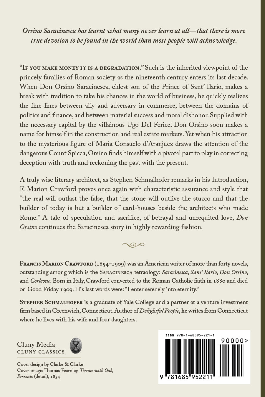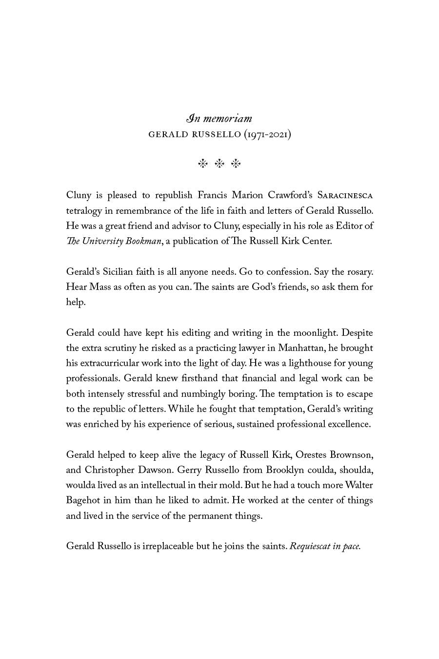 Francis Marion Crawford (1854–1909) was an American writer of more than forty novels, outstanding among which is the Saracinesca tetraology: Saracinesca, Sant’ Ilario, Don Orsino, and Corleone. Born in Italy, Crawford converted to the Roman Catholic faith in 1880 and died on Good Friday 1909. His last words were: “I enter serenely into eternity.”