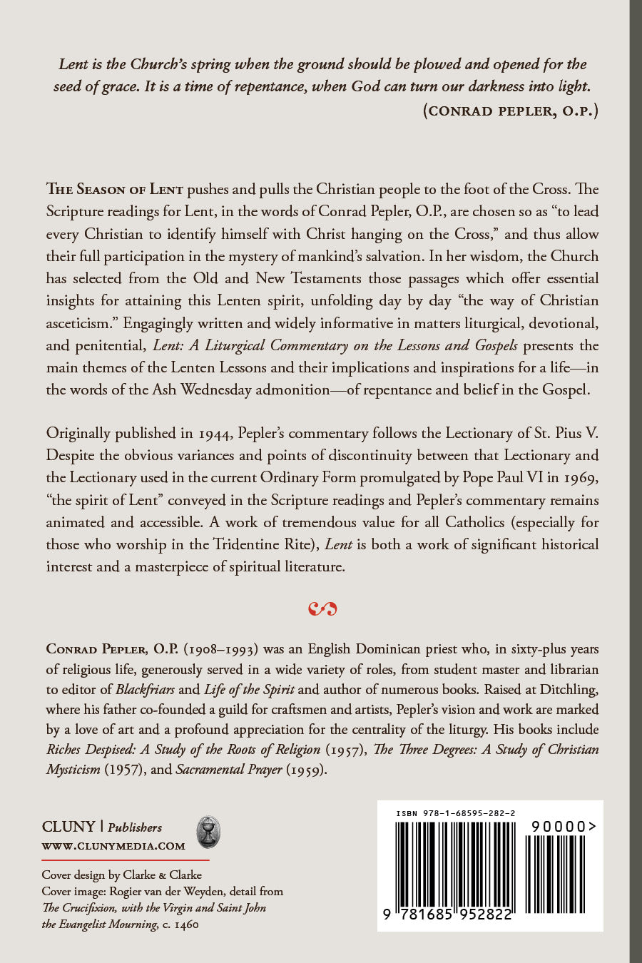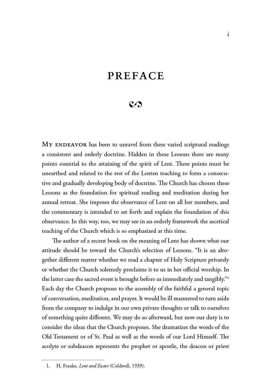 Originally published in 1944, Pepler’s commentary follows the Lectionary of St. Pius V. Despite the obvious variances and points of discontinuity between that Lectionary and the Lectionary used in the current Ordinary Form promulgated by Pope Paul VI in 1969, “the spirit of Lent” conveyed in the Scripture readings and Pepler’s commentary remains animated and accessible. A work of tremendous value for all Catholics (especially for those who worship in the Tridentine Rite), Lent is both a work of significant historical interest and a masterpiece of spiritual literature.