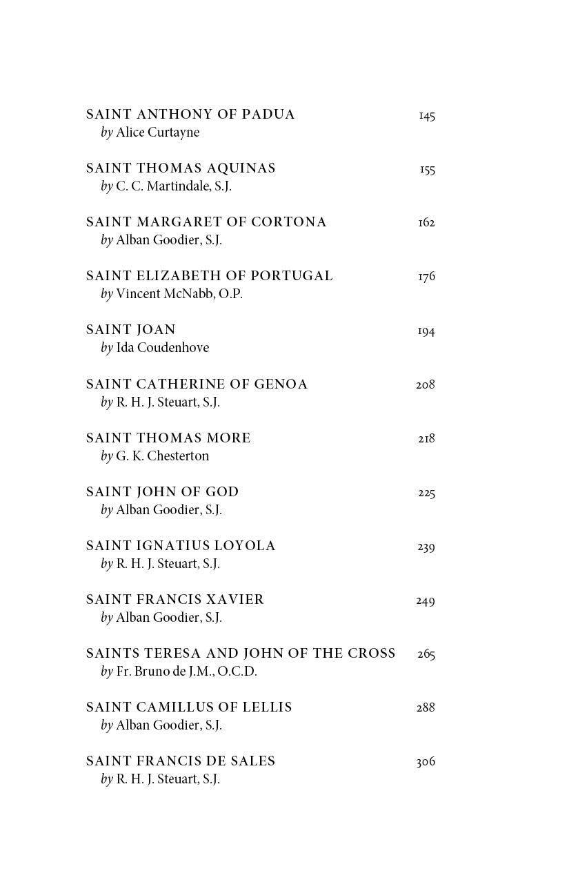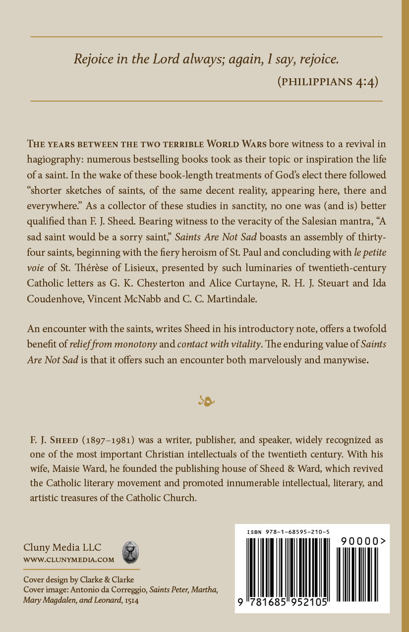 The years between the two terrible World Wars bore witness to a revival in hagiography: numerous bestselling books took as their topic or inspiration the life of a saint. In the wake of these book-length treatments of God’s elect there followed “shorter sketches of saints, of the same decent reality, appearing here, there and everywhere.” As a collector of these studies in sanctity, no one was (and is) better qualified than F. J. Sheed. Bearing witness to the veracity of the Salesian mantra, “A sad saint would be a sorry saint,” Saints Are Not Sad boasts an assembly of thirty-four saints, beginning with the fiery heroism of St. Paul and concluding with le petite voie of St. Thérèse of Lisieux, presented by such luminaries of twentieth-century Catholic letters as G. K. Chesterton and Alice Curtayne, R. H. J. Steuart and Ida Coudenhove, Vincent McNabb and C. C. Martindale.