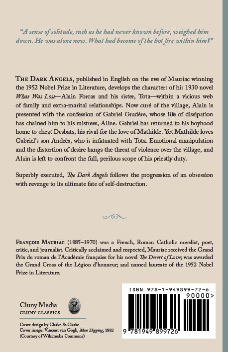 The Dark Angels, published in English on the eve of Mauriac winning the 1952 Nobel Prize in Literature, develops the characters of his 1930 novel What Was Lost—Alain Forcas and his sister, Tota—within a vicious web of family and extra-marital relationships. Now curé of the village, Alain is presented with the confession of Gabriel Gradère, whose life of dissipation has chained him to his mistress, Aline. Gabriel has returned to his boyhood home to cheat Desbats, his rival for the love of Mathilde. Yet Mathilde loves Gabriel’s son Andrès, who is infatuated with Tota. Emotional manipulation and the distortion of desire hangs the threat of violence over the village, and Alain is left to confront the full, perilous scope of his priestly duty.