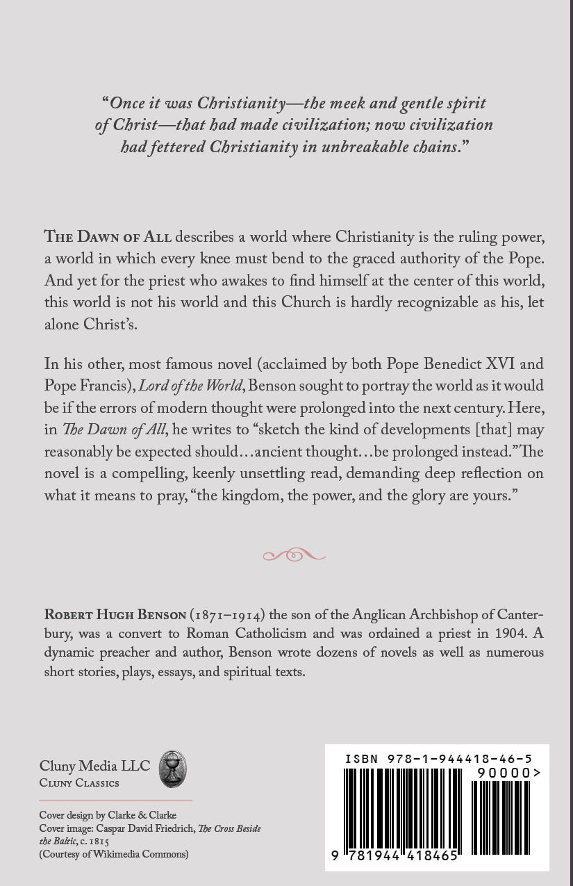 The Dawn of All describes a world where Christianity is the ruling power, a world in which every knee must bend to the graced authority of the Pope. And yet for the priest who awakes to find himself at the center of this world, this world is not his world and this Church is hardly recognizable as his, let alone Christ’s. In his most famous novel, acclaimed by Pope Benedict XVI and Pope Francis, The Lord of the World, Benson sought to portray the world as it would be if the errors of modern thought were prolonged into the next century. Here, in The Dawn of All, he writes to “sketch the kind of developments [that] may reasonably be expected should…ancient thought…be prolonged instead.” The novel is a compelling, keenly unsettling read, demanding deep reflection on what we mean when we pray, “the kingdom, the power, and the glory are yours.”