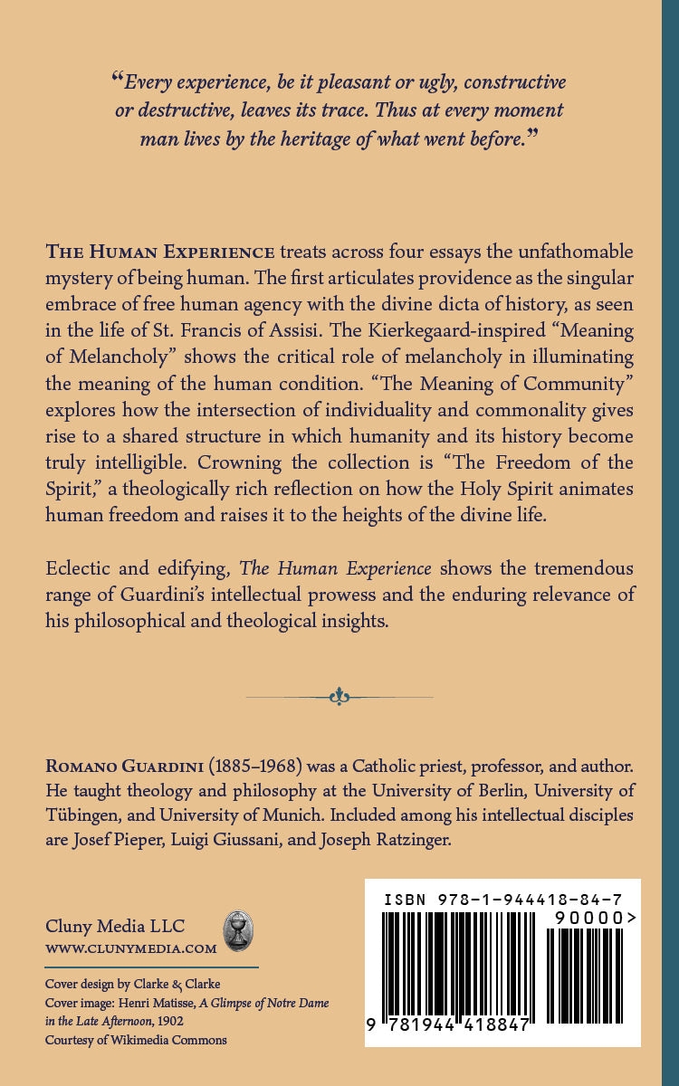The Human Experience shows the tremendous range of Guardini’s intellectual prowess and the enduring relevance of his philosophical and theological insights. These essays converge into a discourse on the unfathomable mystery of what it means to be human.