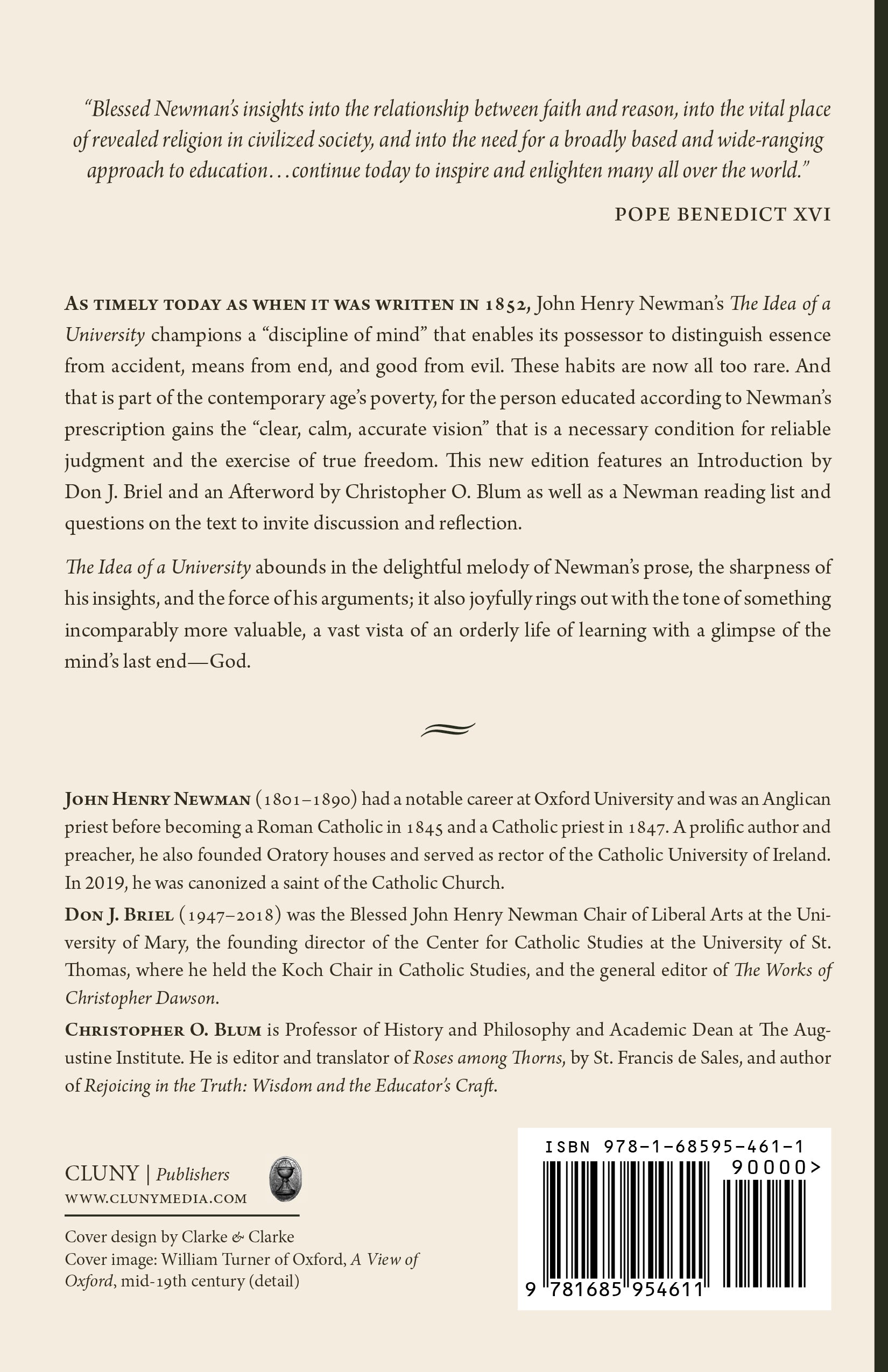 As timely today as when it was written in 1852, John Henry Newman’s The Idea of a University champions a “discipline of mind” that enables its possessor to distinguish essence from accident, means from end, and good from evil. These habits are now all too rare. And that is part of the contemporary age’s poverty, for the person educated according to Newman’s prescription gains the “clear, calm, accurate vision” that is a necessary condition for reliable judgment and the exercise of true freedom. This new edition features an Introduction by Don J. Briel and an Afterword by Christopher O. Blum as well as a Newman reading list and questions on the text to invite discussion and reflection.