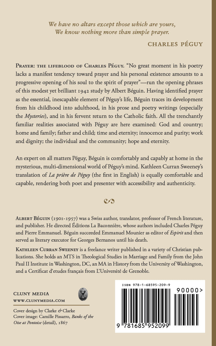 Prayer: the lifeblood of Charles Péguy. “No great moment in his poetry lacks a manifest tendency toward prayer and his personal existence amounts to a progressive opening of his soul to the spirit of prayer”—run the opening phrases of this modest yet brilliant 1942 study by Albert Béguin. Having identified prayer as the essential, inescapable element of Péguy’s life, Béguin traces its development from his childhood into adulthood, in his prose and poetry writings (especially the Mysteries), and in his fervent return to the Catholic faith. All the trenchantly familiar realities associated with Péguy are here examined: God and country; home and family; father and child; time and eternity; innocence and purity; work and dignity; the individual and the community; hope and eternity.