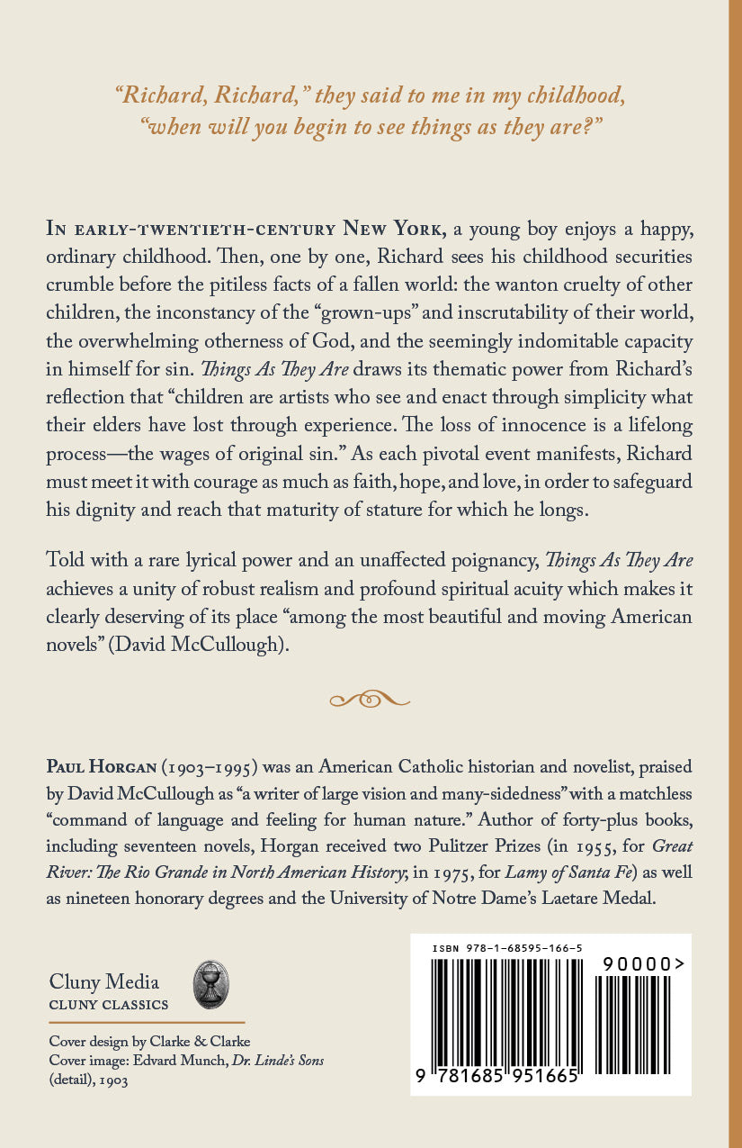 In early-twentieth-century New York, a young boy enjoys a happy, ordinary childhood. Then, one by one, Richard sees his childhood securities crumble before the pitiless facts of a fallen world: the wanton cruelty of other children, the inconstancy of the “grown-ups” and inscrutability of their world, the overwhelming otherness of God, and the seemingly indomitable capacity in himself for sin. Things As They Are draws its thematic power from Richard’s reflection that “children are artists who see and enact through simplicity what their elders have lost through experience. The loss of innocence is a lifelong process—the wages of original sin.” As each pivotal event manifests, Richard must meet it with courage as much as faith, hope, and love, in order to safeguard his dignity and reach that maturity of stature for which he longs.
