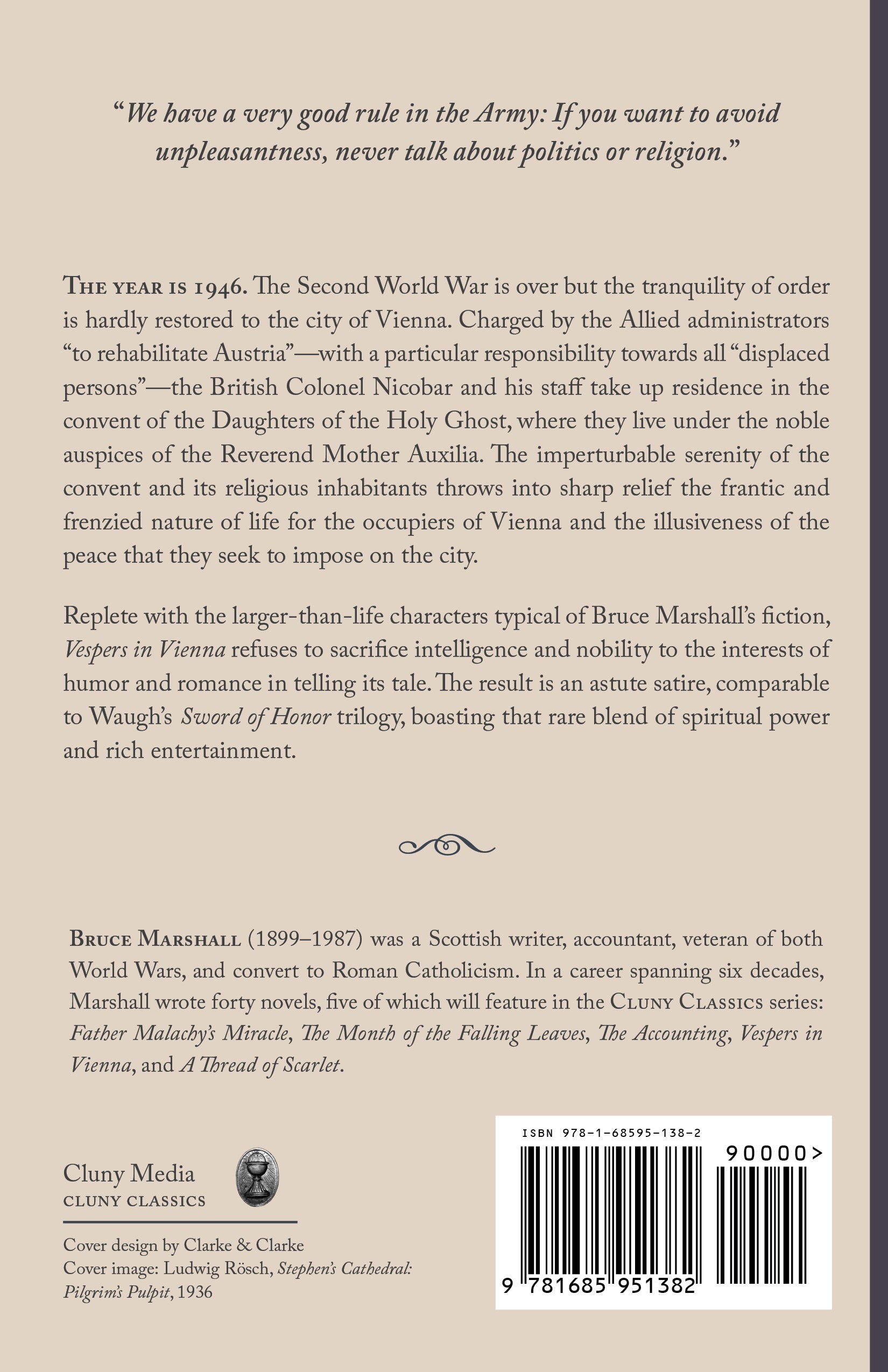 Replete with the larger-than-life characters typical of Bruce Marshall’s fiction, Vespers in Vienna refuses to sacrifice intelligence and nobility to the interests of humor and romance in telling its tale. The result is an astute satire, comparable to Waugh’s Sword of Honor trilogy, boasting that rare blend of spiritual power and rich entertainment.