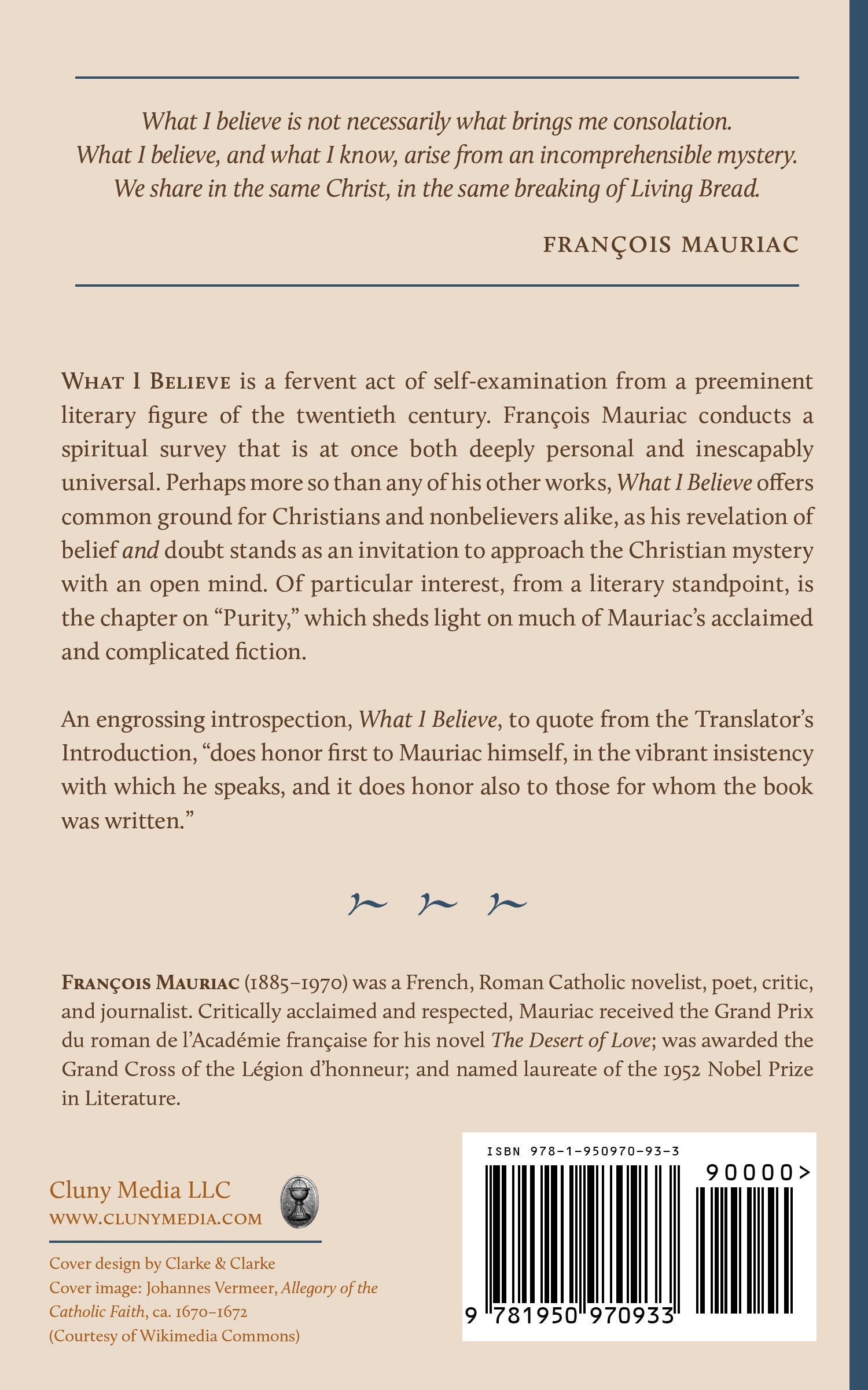 What I Believe conducts a spiritual survey that is at once both deeply personal and inescapably universal. Perhaps more so than any of Mauriac's other works, What I Believe offers common ground for Christians and nonbelievers alike, as his revelation of belief and doubt stands as an invitation to approach the Christian mystery with an open mind. Of particular interest, from a literary standpoint, is the chapter on “Purity,” which sheds light on much of Mauriac’s acclaimed and complicated fiction.