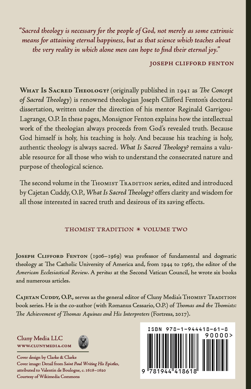 What Is Sacred Theology? (originally published in 1941 as The Concept of Sacred Theology), is renowned theologian Joseph Clifford Fenton’s doctoral dissertation, written under the direction of his mentor Reginald Garrigou-Lagrange, O.P. In these pages, Monsignor Fenton explains how the intellectual work of the theologian always proceeds from God’s revealed truth. Because God himself is holy, his teaching is holy. And because his teaching is holy, authentic theology is always sacred. What Is Sacred Theology? remains a valuable resource for all those who wish to understand the consecrated nature and purpose of theological science.